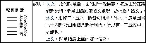 上舉文字,假若您的易卦基礎還不錯,那麼就已經知曉一、二了;不過,如果沒有相當的易卦觀念,那麼有幾個名詞,就必須先向您解釋,下舉「乾卦」為例。