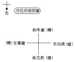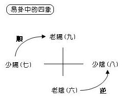 易卦系統中所謂的四象就是老陽、少陽、老陰、少陰,而方位學也有所謂的四象,即左青龍、右白虎、前朱雀、後玄武,其二者間有無關聯呢?尚待考證。不過,假使將此兩個四象圖像化,則會發現這樣有趣的結果: